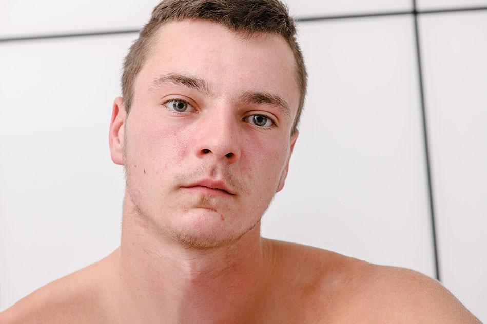 Hugo a 19 ans et apprentis couvreur en bâtiment. Belle gueule, belle carrure, ce beau gosse cultive aussi un air très petite frappe. Comme vous allez le voir, il ne sourit pas beaucoup mais c’est aussi pour cacher sa grande timidité.